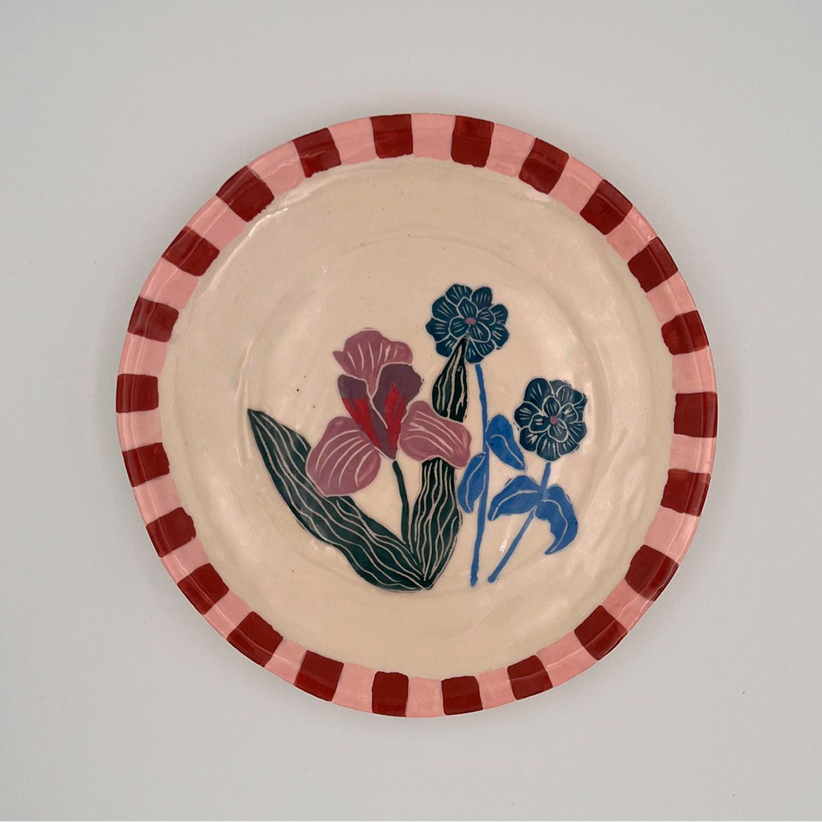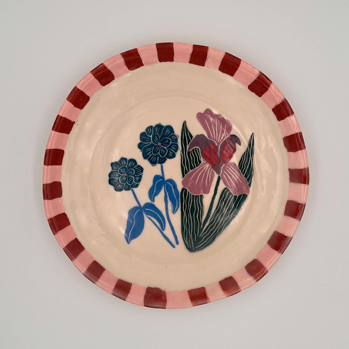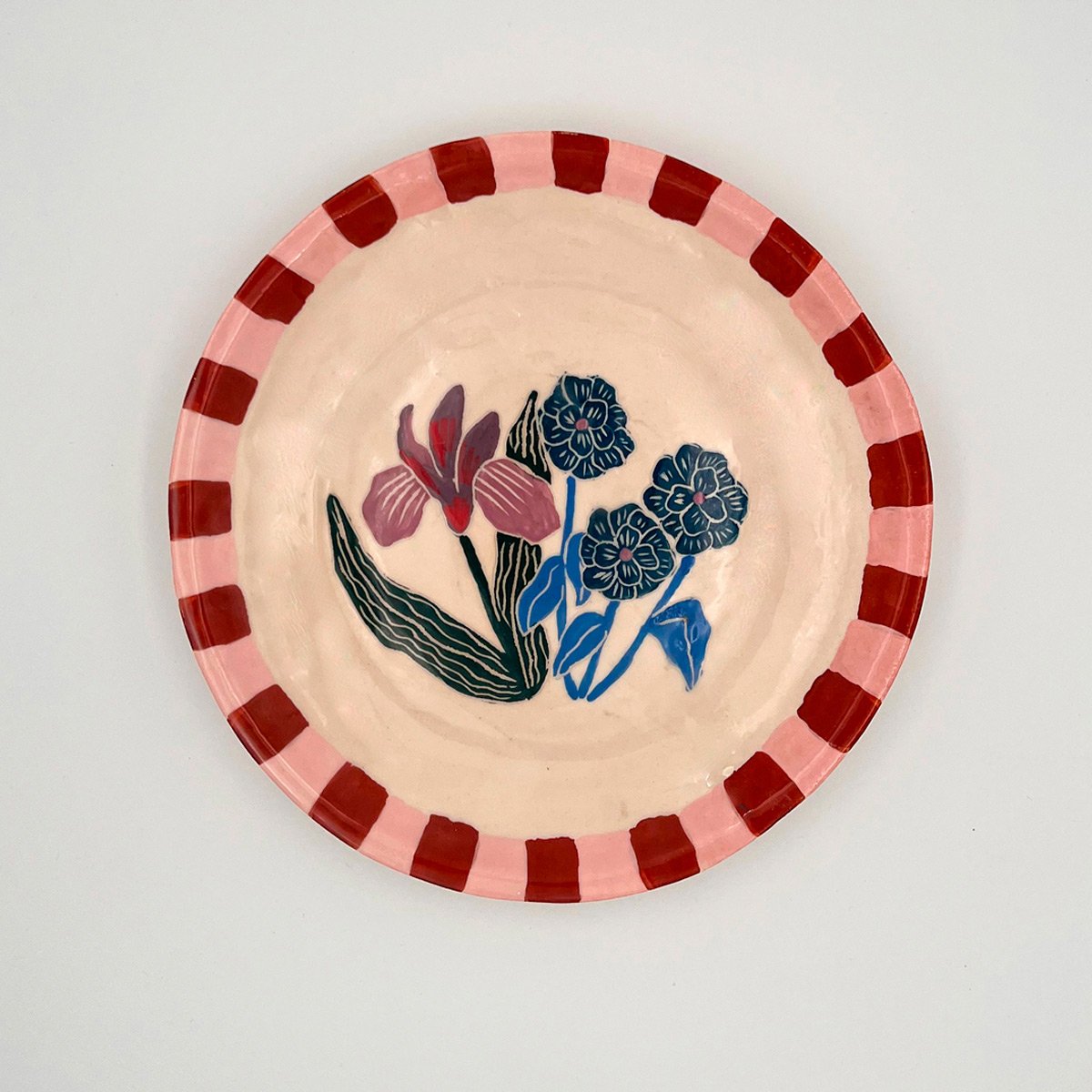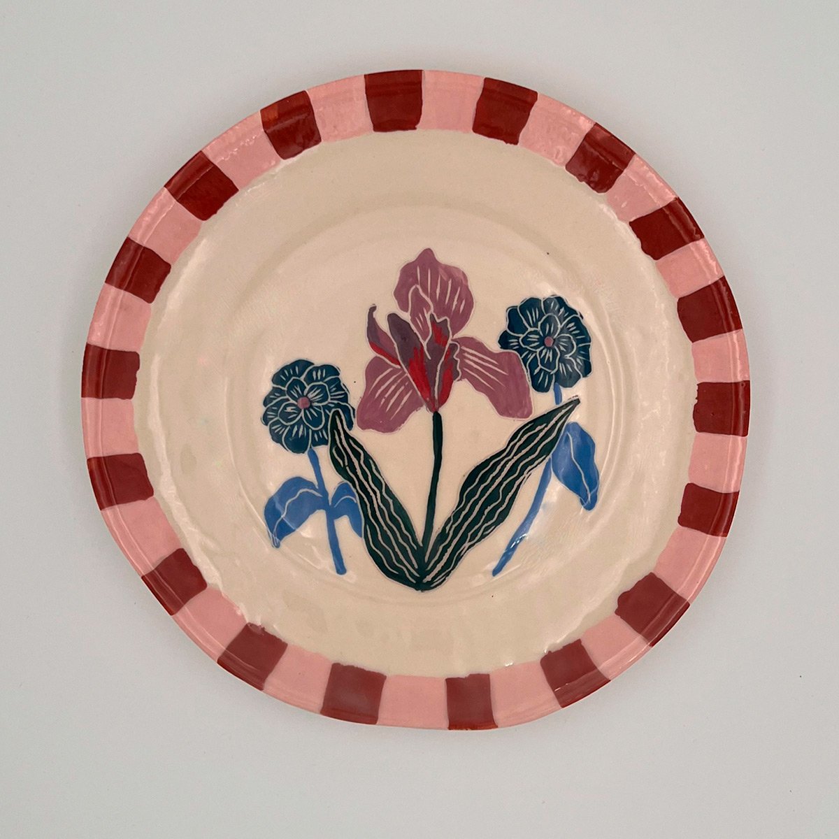 Platos Iris – Platos de cerámica artesanal de la línea Flores. Juego de 8 platos pintados a mano con flores Iris con guarda rosa y brick. Diámetro: 25 cm. Entrega inmediata.