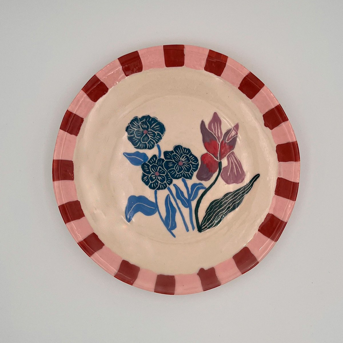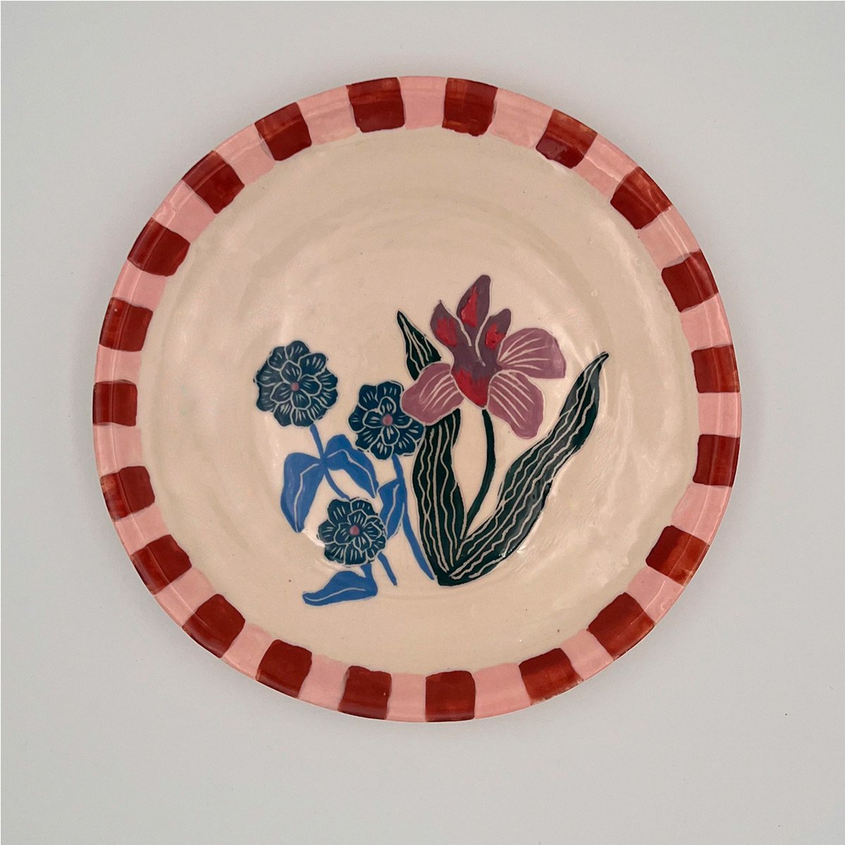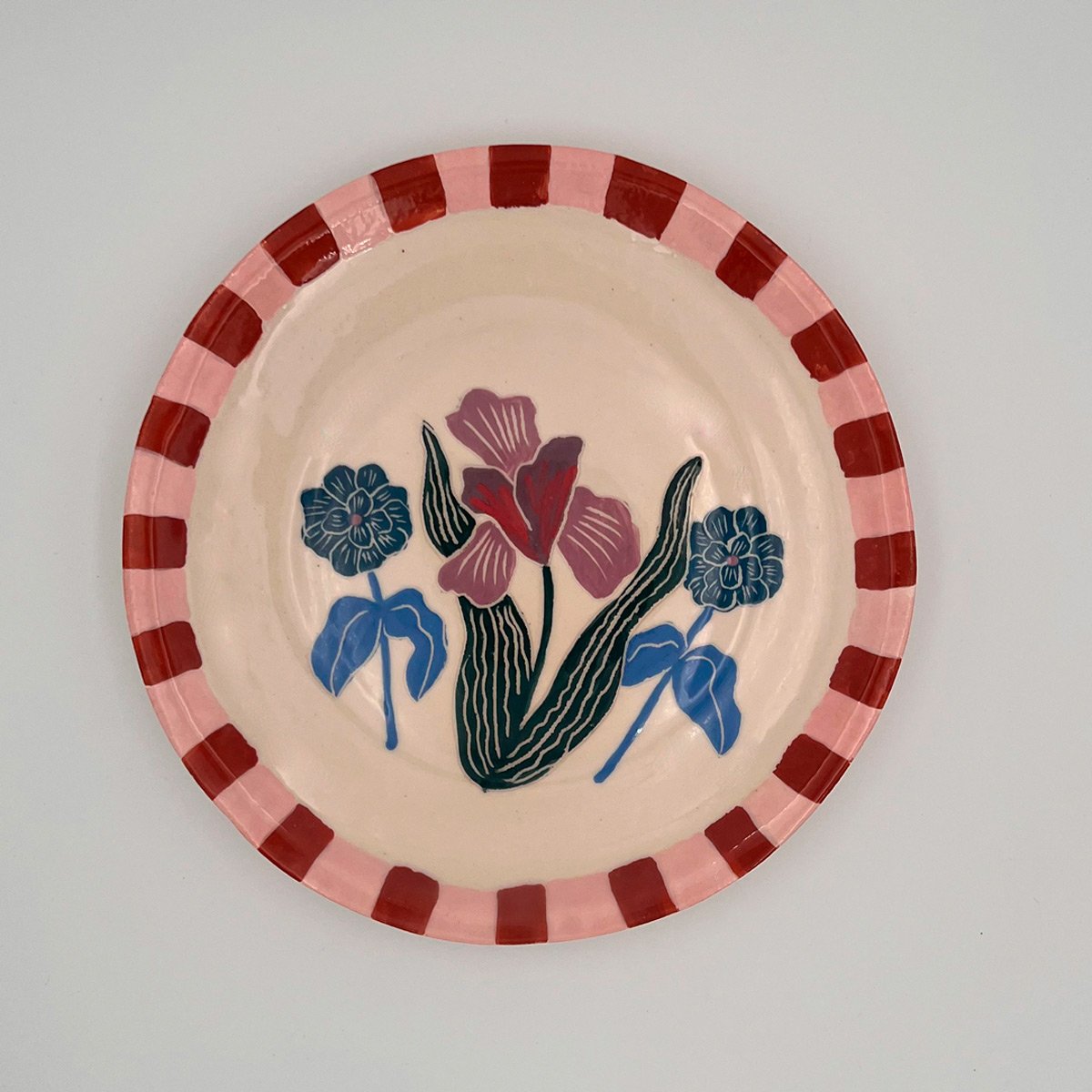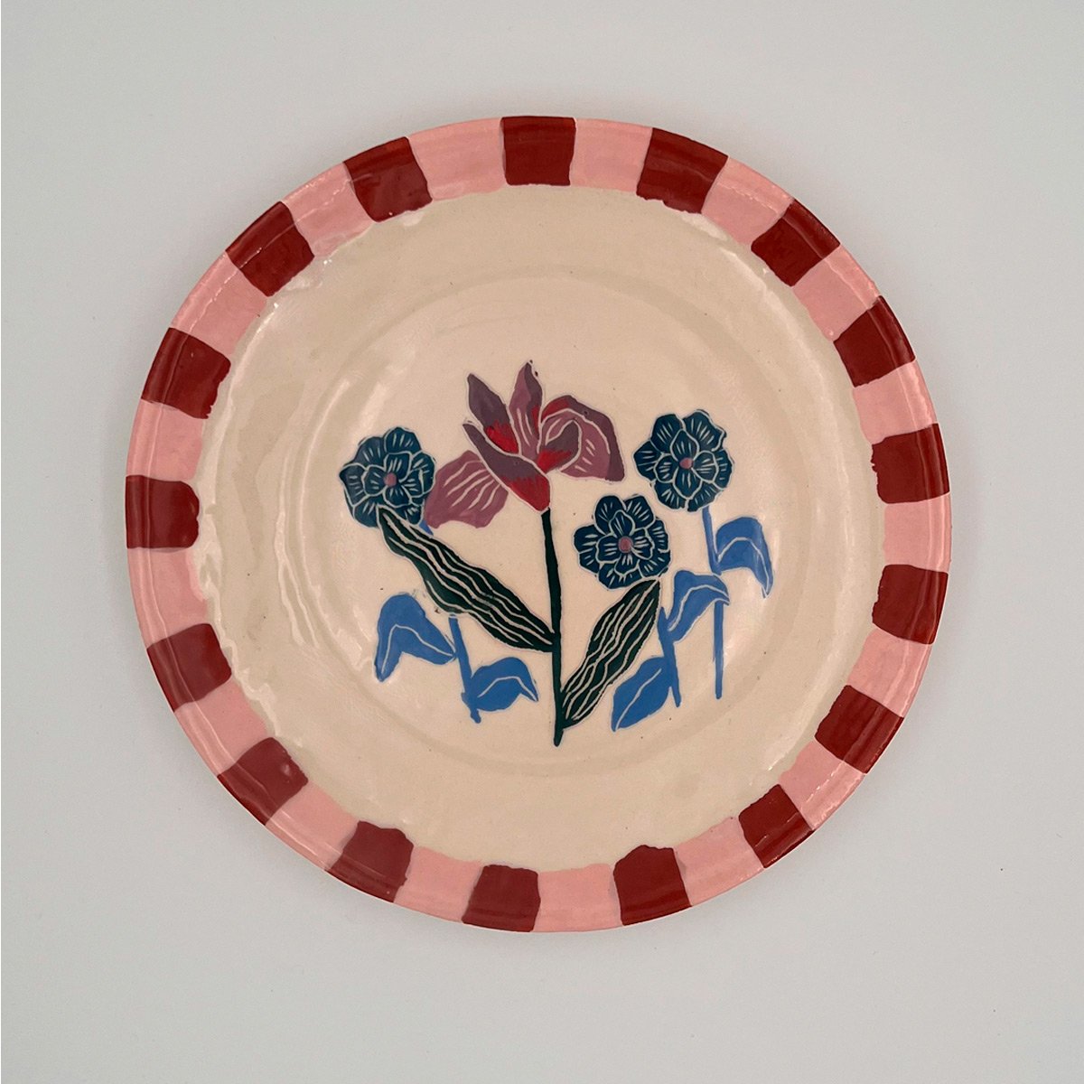 Platos Iris – Platos de cerámica artesanal de la línea Flores. Juego de 8 platos pintados a mano con flores Iris con guarda rosa y brick. Diámetro: 25 cm. Entrega inmediata.